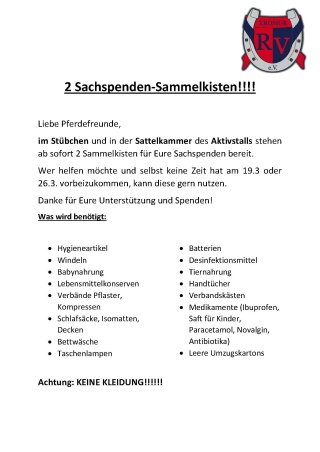 Wer nicht vor Ort seine Spenden abgeben kann, kann sie im Stall in den vorbereiteten Kisten hinterlegen. Wir bringen Sie dann mit zur Sammelstelle.